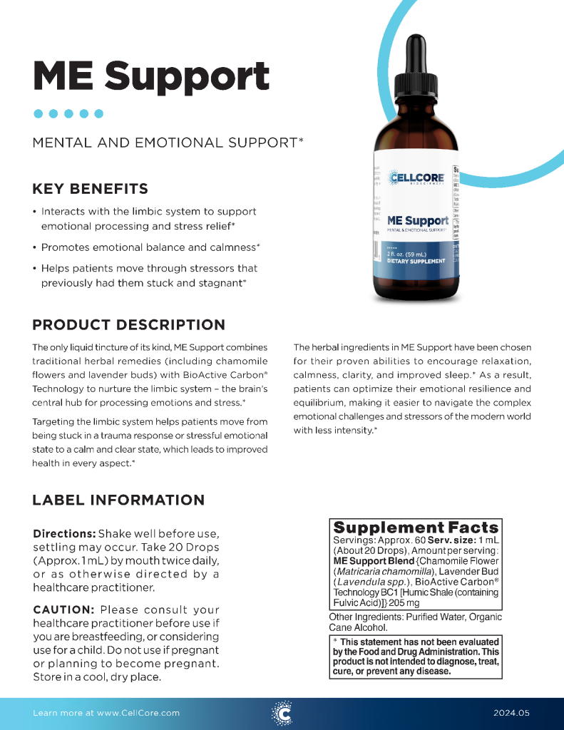 ME Support is a liquid tincture that combines traditional herbal remedies with BioActive Carbon® Technology to nurture the limbic system – the brain’s central hub for processing emotions and stress.*